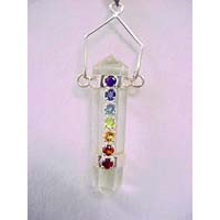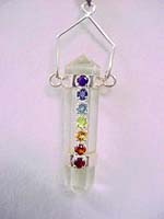 From India. Faceted Chakra stones in a sterling silver setting on a Double Terminated Clear Quartz Point. The seven chakras are wheels of bioenergetic activity radiating from nerve ganglia (clusters) that start at the base of the spine and continue on to the crown of the head.